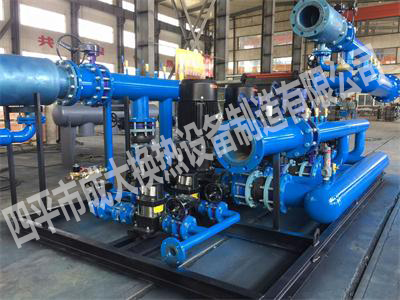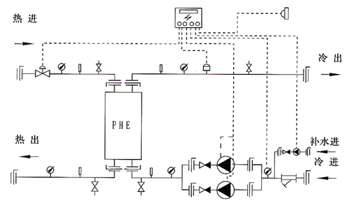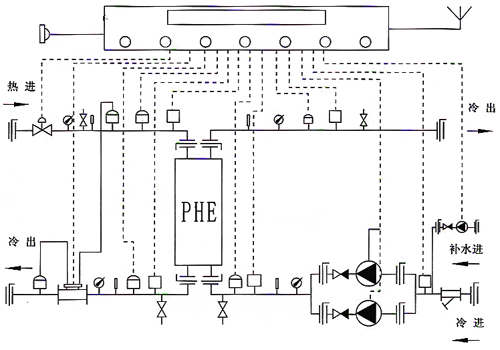 全自動無人值守現場控制換熱機組,具有手動控制換熱機組功能外,一次網配有電動調節閥,控制二次網的供水溫度,具有室外溫度補償功能,循環泵采用變頻控制,利用二次網供回水壓差作為反饋信號,二次網進行變量控制,不水泵采用變頻補水,根據二次網回水壓差作為反饋信號。所有水泵,電動調節閥,二次網供水溫度等均由控制器來完成全自動控制,并且控制器能夠控制程序來自動完成機組的啟停及復電后重新啟動,一個水箱水位傳感器接入控制器自動控制水箱水位。而且具有缺水保護不水泵功能;二次網回水管線加裝卸壓裝置,正常情況下,該機組處于無人值守自動運行狀態,只需工作人員定期進行巡查。